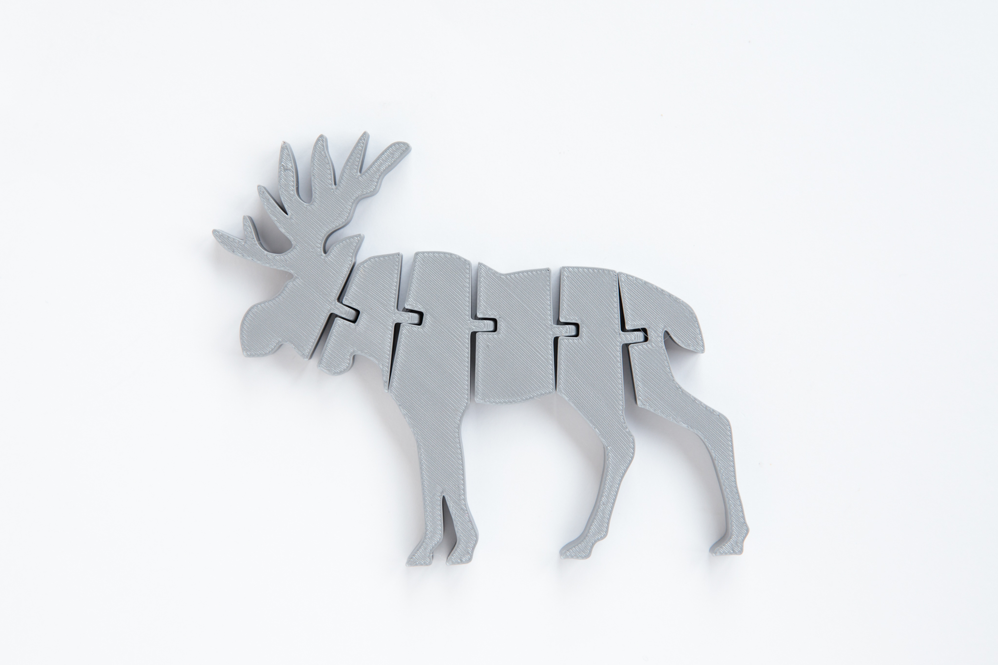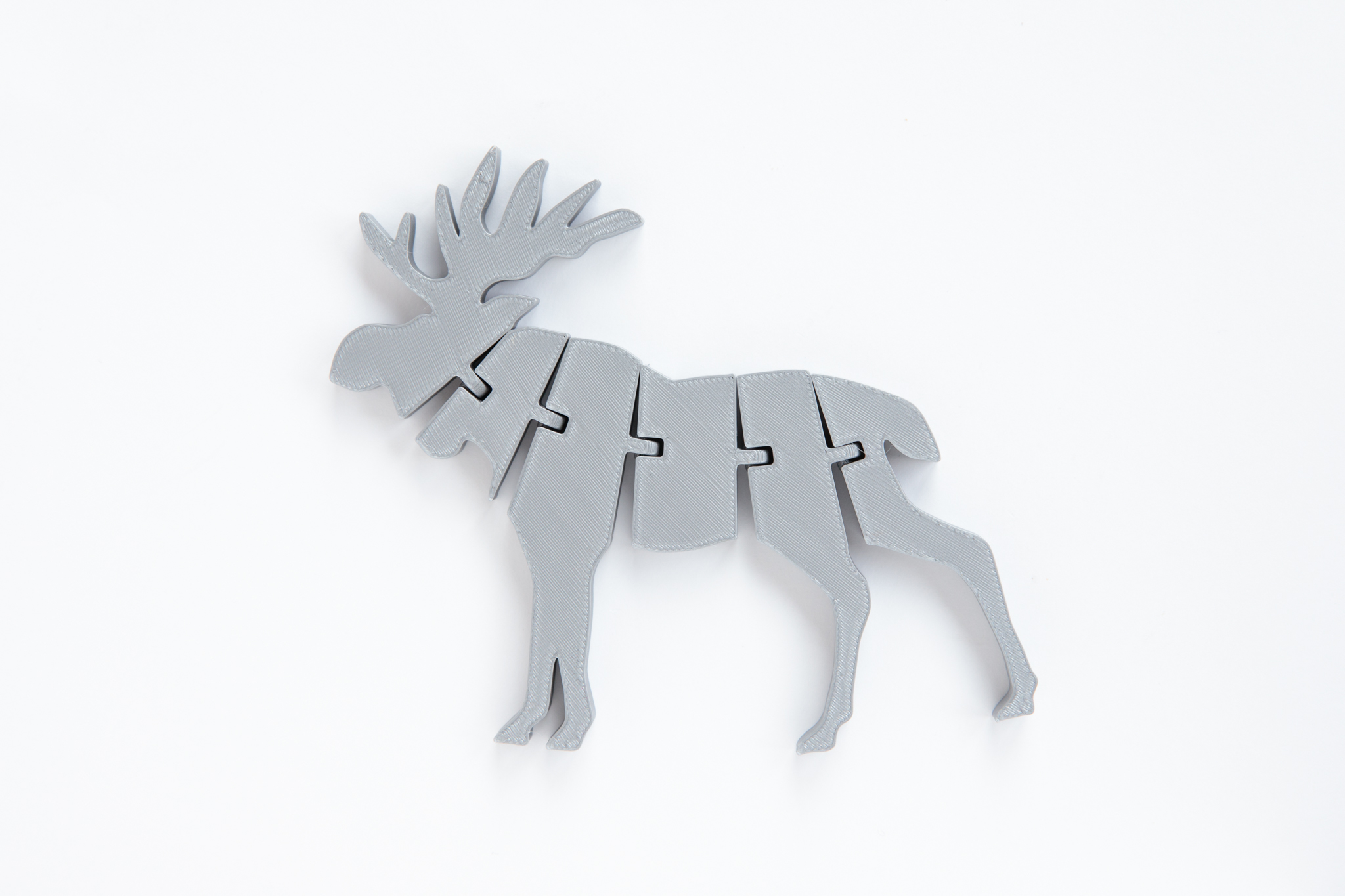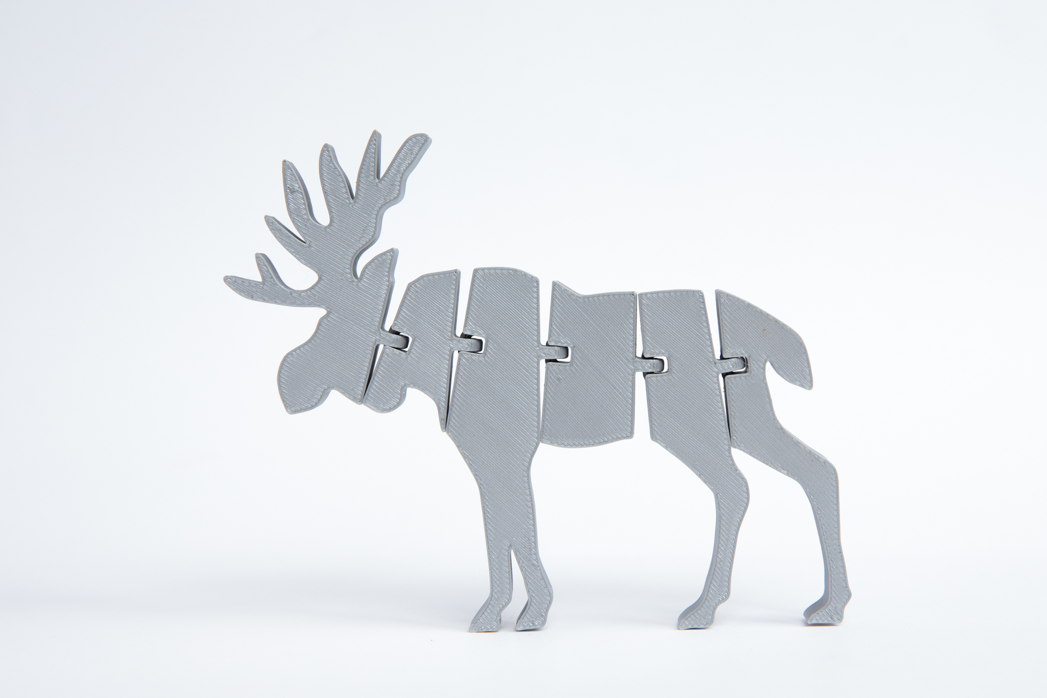Flexible moose that can stand up on its own and has joints so it can flex horizontally and vertically. Size is approximately 12cm long, 10cm high and 1cm thick.