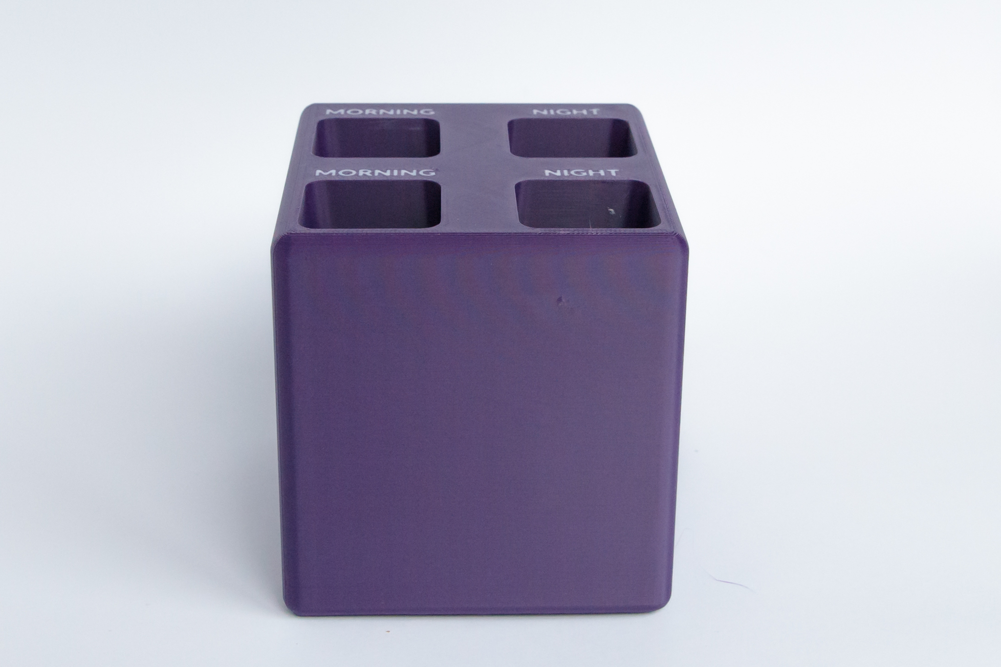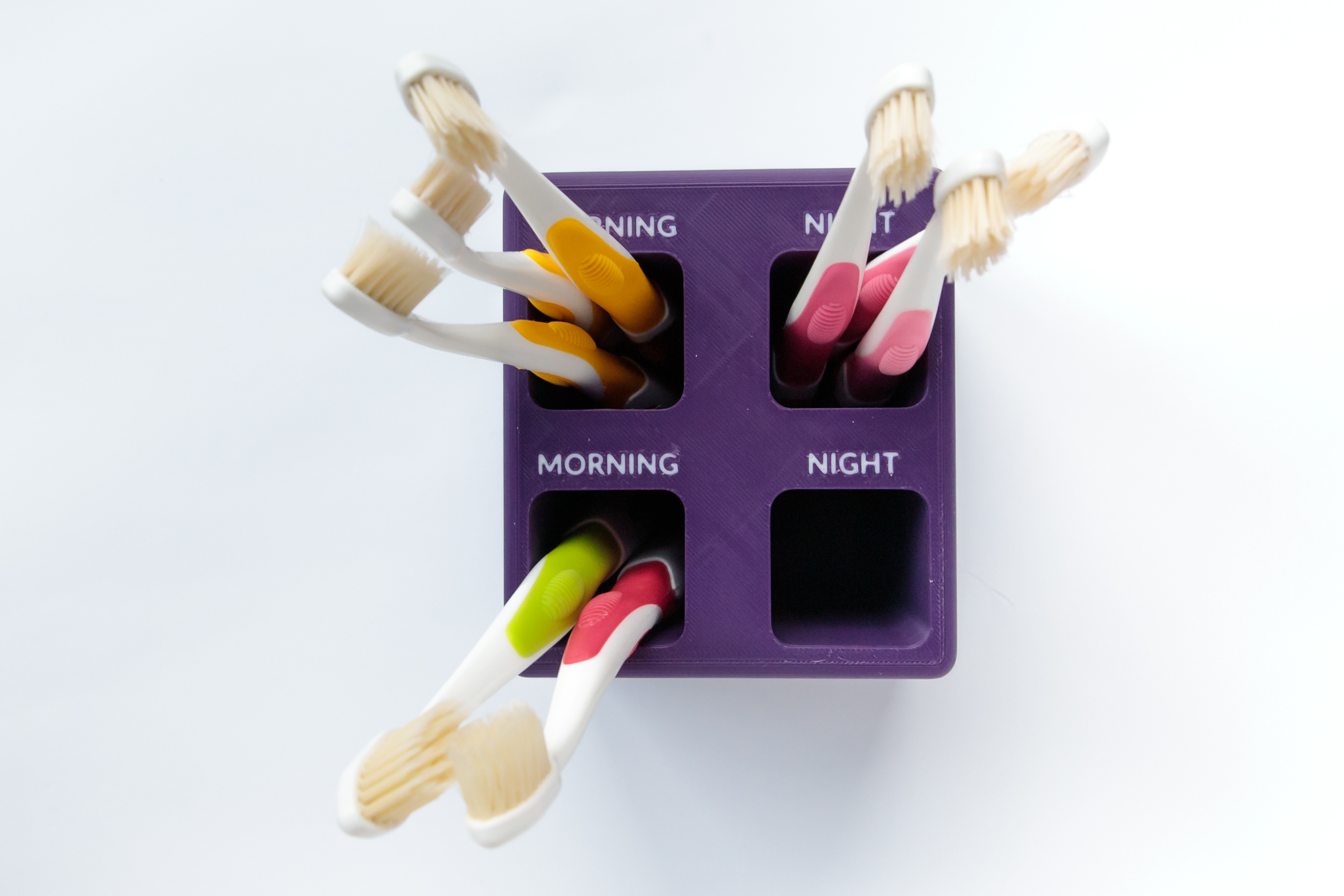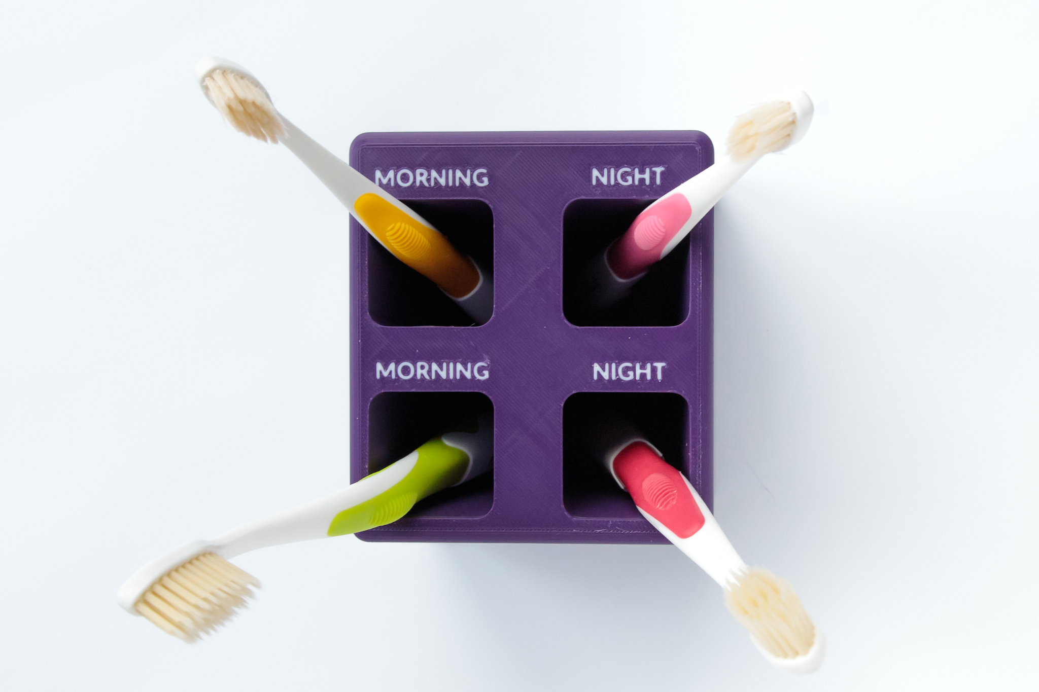 3D printed morning and night toothbrush holder with four completely separate toothbrush spaces. If you follow Dr Ellie Phillips’ Complete Mouth Care System of mouth rinses and xylitol (https://drellie.com/complete-mouth-care-system/), you’ll know you need a morning toothbrush and a night toothbrush to allow 24 hours for the damaging bacteria to dry on each toothbrush. This toothbrush holder will hold four Dr Plotka’s Mouthwatchers toothbrushes in separate compartments. If your family is all following the protocol, you can fit two adult toothbrushes and three youth toothbrushes in each compartment if you want to keep some family members’ toothbrushes together.