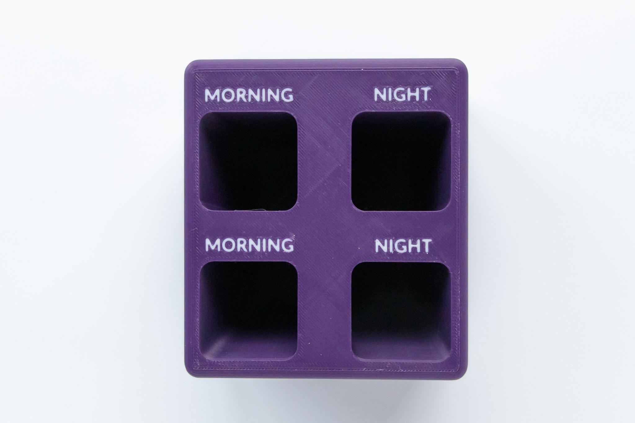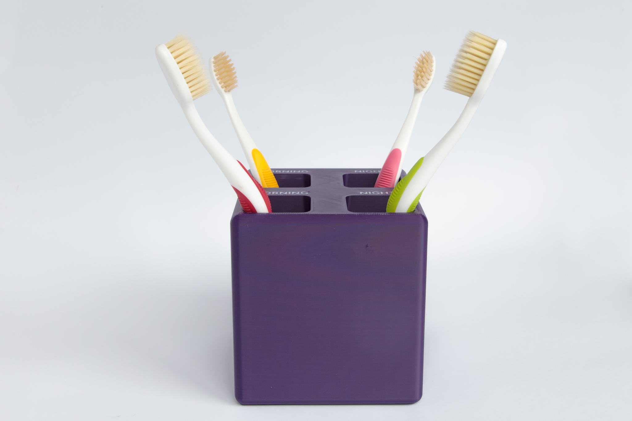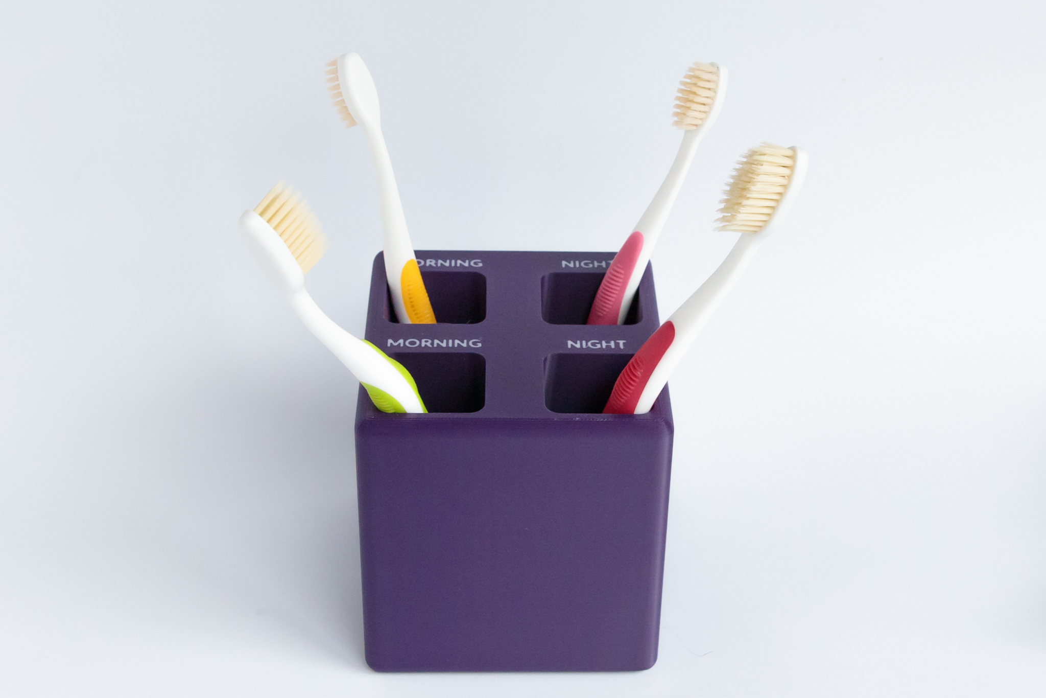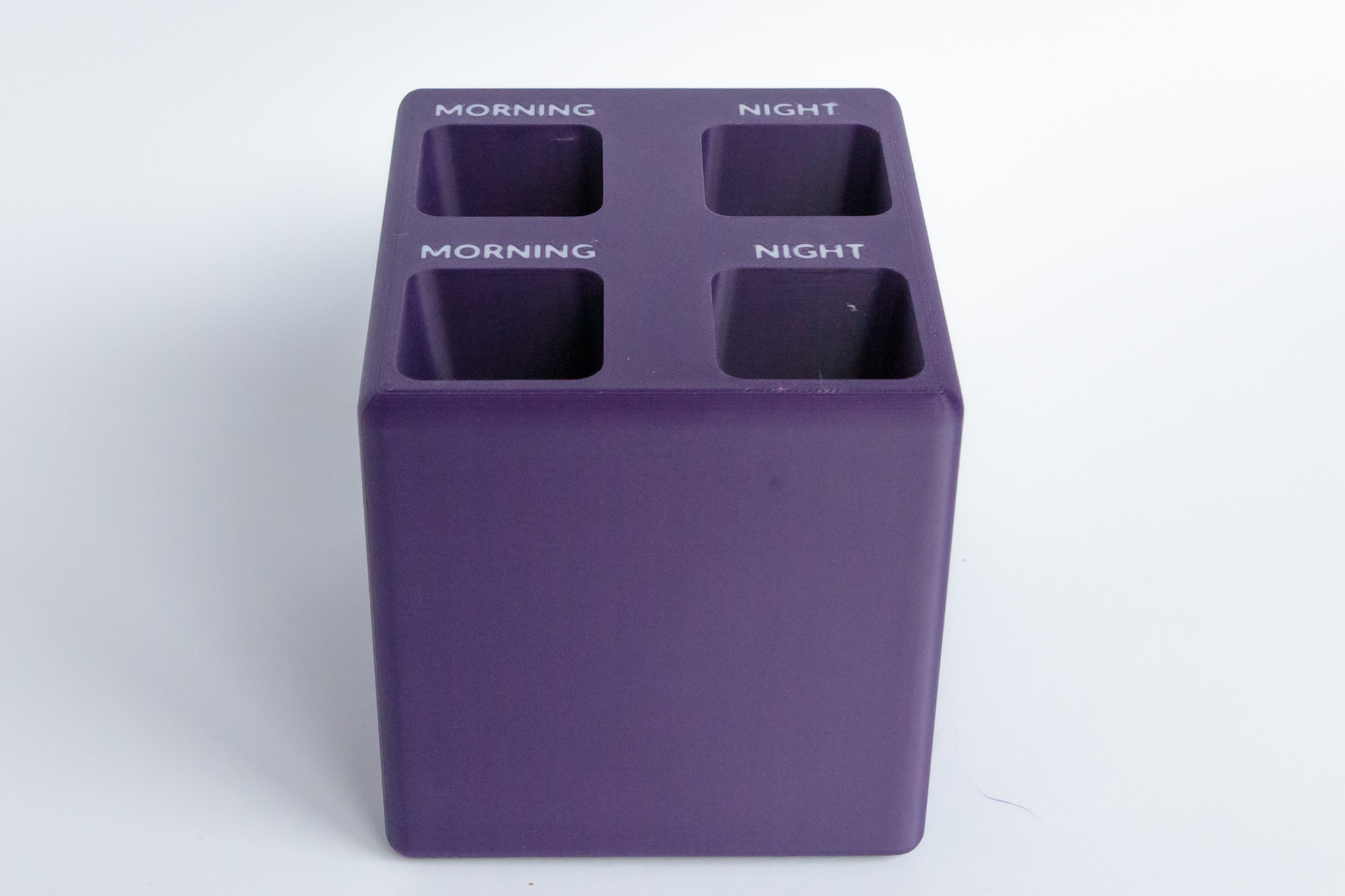 3D printed morning and night toothbrush holder with four completely separate toothbrush spaces. If you follow Dr Ellie Phillips’ Complete Mouth Care System of mouth rinses and xylitol (https://drellie.com/complete-mouth-care-system/), you’ll know you need a morning toothbrush and a night toothbrush to allow 24 hours for the damaging bacteria to dry on each toothbrush. This toothbrush holder will hold four Dr Plotka’s Mouthwatchers toothbrushes in separate compartments. If your family is all following the protocol, you can fit two adult toothbrushes and three youth toothbrushes in each compartment if you want to keep some family members’ toothbrushes together.