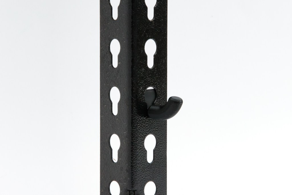 Set of six shelf hooks for garage shelving units like those from Bunnings or Mitre 10. The hooks fit into the 6mm wide lower part of the keyhole slots in the metal support legs. Each hook is approximately 3cm long and 1.5cm wide.